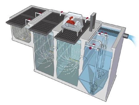 1. COMPARTIMENTO DE PRE-TRATAMIENTO: Una planta comercial de Jet para el tratamiento de aguas residuales utiliza componentes como filtros de rejilla, trituradores de basura y trampas para capturar objetos grandes y desintegrar todo lo que no pueda ser tratado, tal como plástico o metal, para que no puedan entrar en el proceso de tratamiento. Estas aguas residuales pre-tratadas son enviadas al Tanque de Aireación.